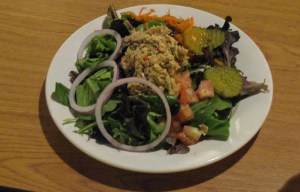 My partner ordered the BBQ and coleslaw sandwich. He likes his food HOT, so he ordered both the BBQ sauce AND the Buffalo sauce, as well as a side of jalapeno peppers. The waitress brought him both sauces and jalapeno peppers on the side, with no charge for the extra sauce or the peppers! The sandwich was absolutely incredible. On further investigation, we discovered it was made from jackfruit – which gave it a seriously meat-like texture. His side was salt potatoes (white baby potatoes boiled in their skins in extra-salty water, which forms a salty crust on the skin and leaves the insides extra creamy). Also very good.