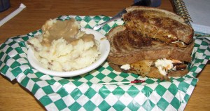 I ordered the Classic Reuben, because it’s one of those things I loved as an omnivore and never found a decent substitute for. Until now. This was excellent. House made “corned beef” with sauerkraut, Daiya cheese and Thousand Island, served on grilled marbled rye. I ordered mashed potatoes with gravy as my side. They were the perfect fluffy consistency, not too lumpy yet not overly mashed into sticky gluelike goo. The gravy appeared to be mushroom based and was also very good – I would have just liked a little more of it.
