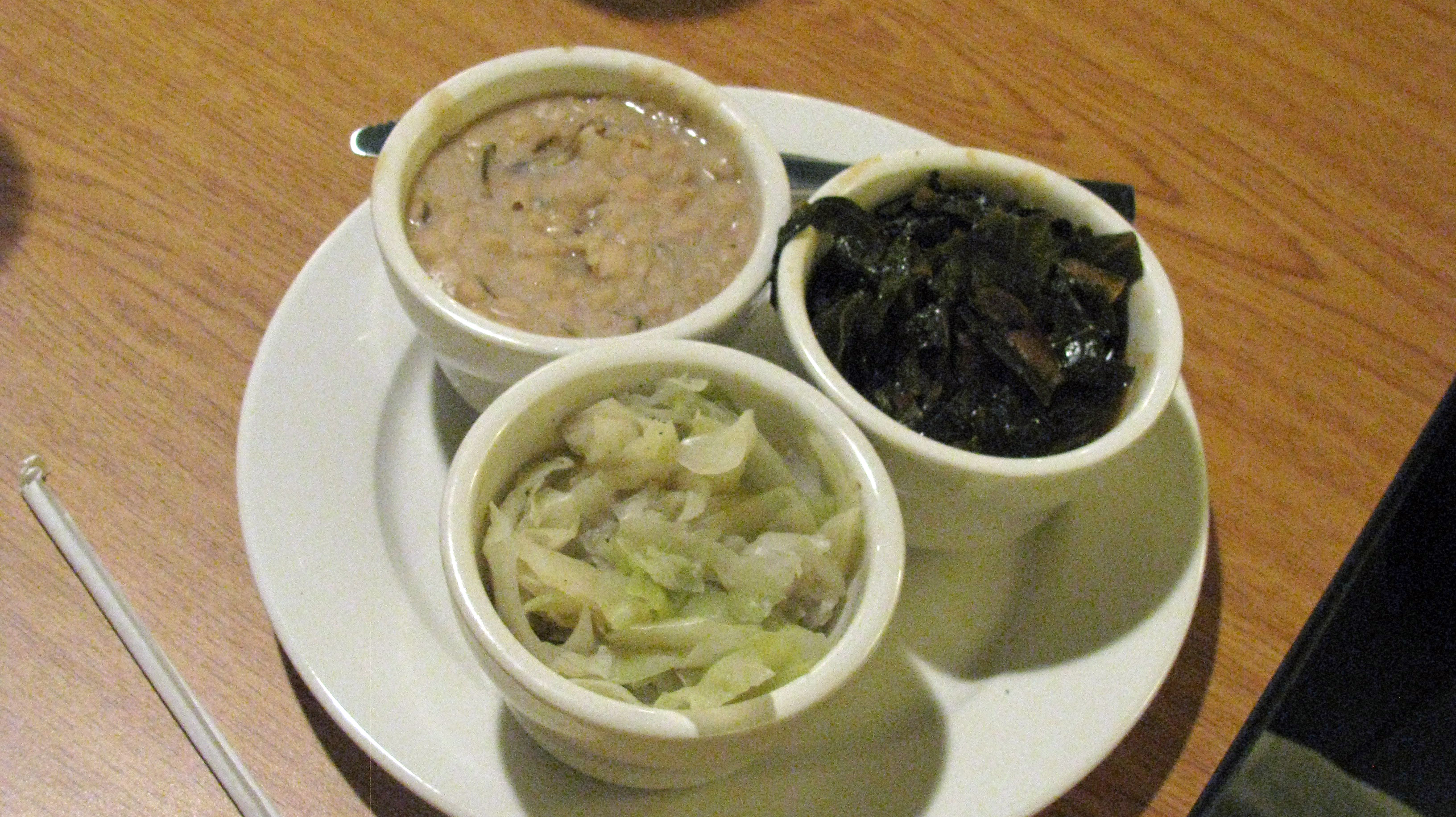 There’s also a long list of veggie sides on the permanent menu – including mashed potatoes and gravy, macaroni and cheeze, macaroni salad, collards, braised kale, braised cabbage, and, yes, BEANS! PINTO beans (of course), and northern beans with rosemary and thyme, and “mega bean salad.”