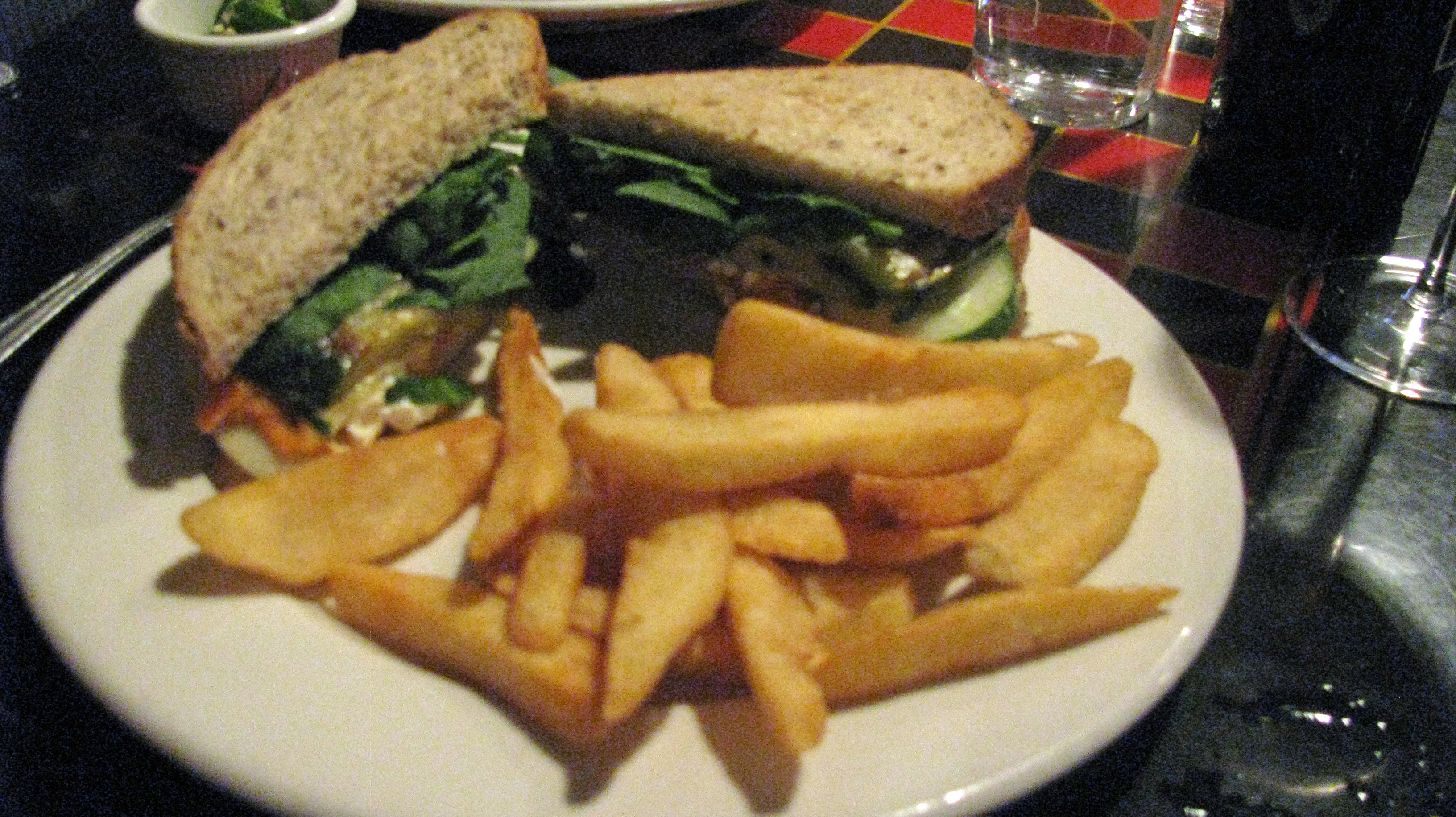 Vegetarian: Black Bean Veggie Burger (this is house made and better than the usual. You can make it a bit more vegan-ish by ordering it without the provolone cheese and mayo. The burger itself does contain a little egg, though). Spicy Asparagus and Portobello Grilled Cheese; Broccoli Parmesan Sandwich; and Vegetable Club – one of the better “salad sandwiches” I’ve eaten. Cucumbers, shredded carrots, grilled zucchini, tomatoes, spinach, provolone, goat cheese, and honey mustard. If you’re feeling vegan-ish, leave off the provolone – you don’t need it in this sandwich. The goat cheese, alas, does add something.