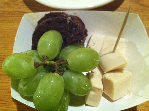 At the second tasting, there was less food but it was better matched to the wines. The little cheezy crackers. Popcorn, paired with a sparkling white wine – a surprisingly good match! Individual plates of fancy house-made vegan sausage – former omnivores should think of specialty Christmas sausages from Harry & David or Hickory Farms – served with grapes and cubes of Daiya jack style wedge cheese. And, again, those wonderful little ginger cookies!