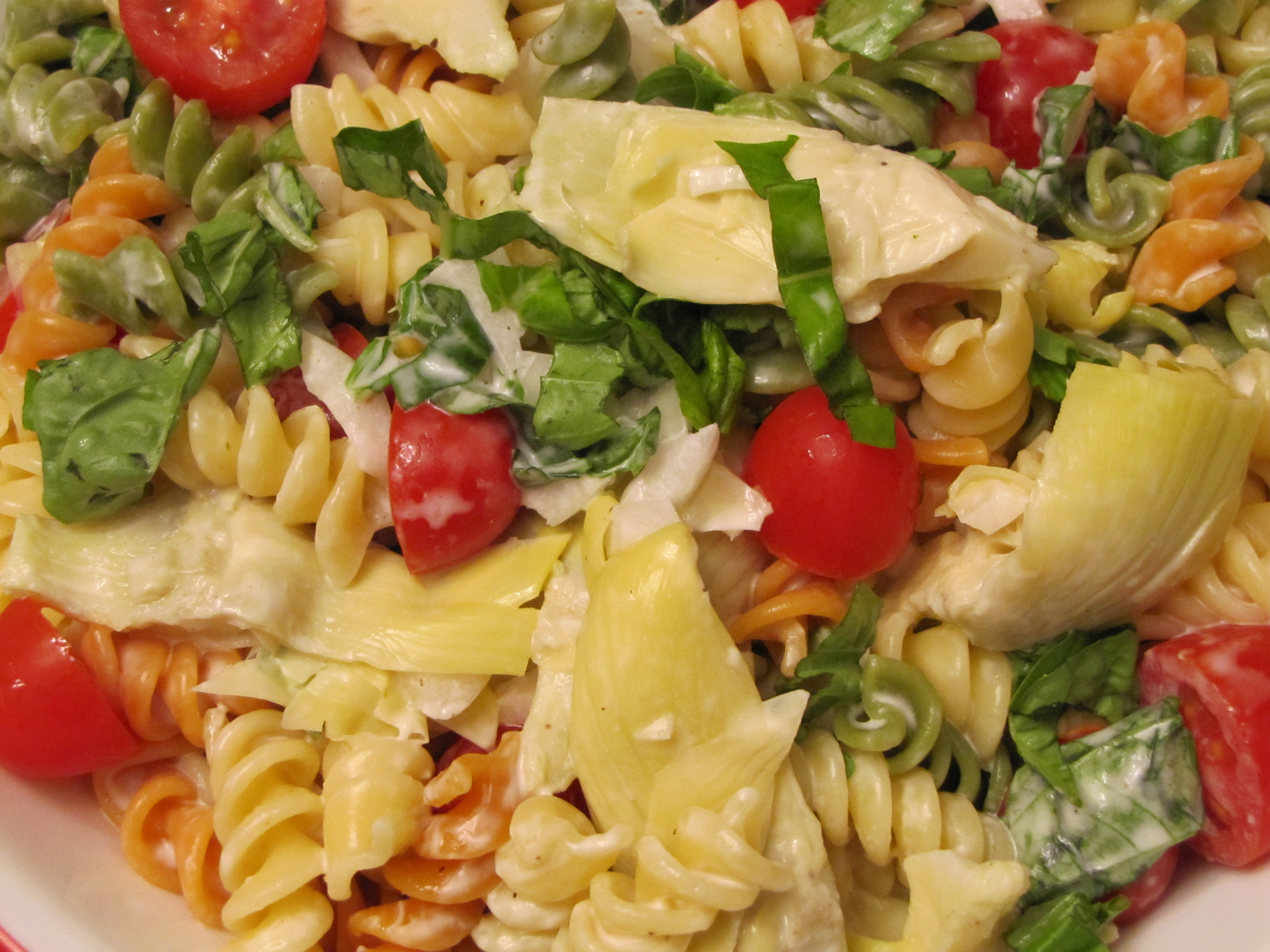 “This one” is a simple little vegan recipe I adapted from PETA’s oldie-but-goodie cookbook, “The Compassionate Cook.” I almost overlooked it, as it is listed simply as “Creamy Pasta Salad,” but thankfully I didn’t. I made a few minor tweaks – Added tomatoes! Fresh basil! And double the amount of artichokes! – and the salad found its way into my artichoke-lovin’ partner’s lunch box on a number of occasions last year.