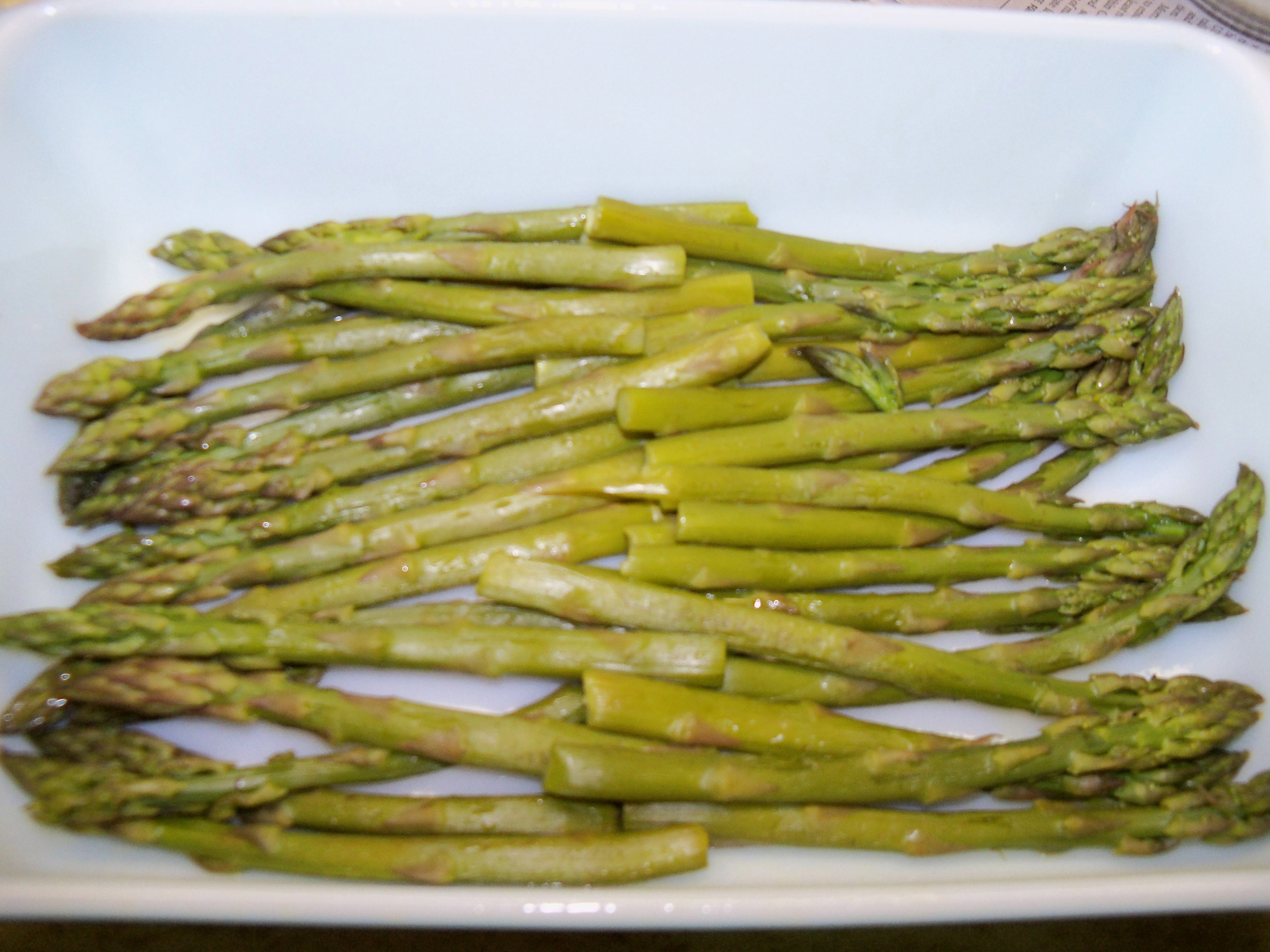 Snap the woody ends off the asparagus and discard. Rinse the asparagus tops and then steam for approx. 8 – 10 minutes – until “tender-crisp,” as they say. Then arrange in casserole dish.