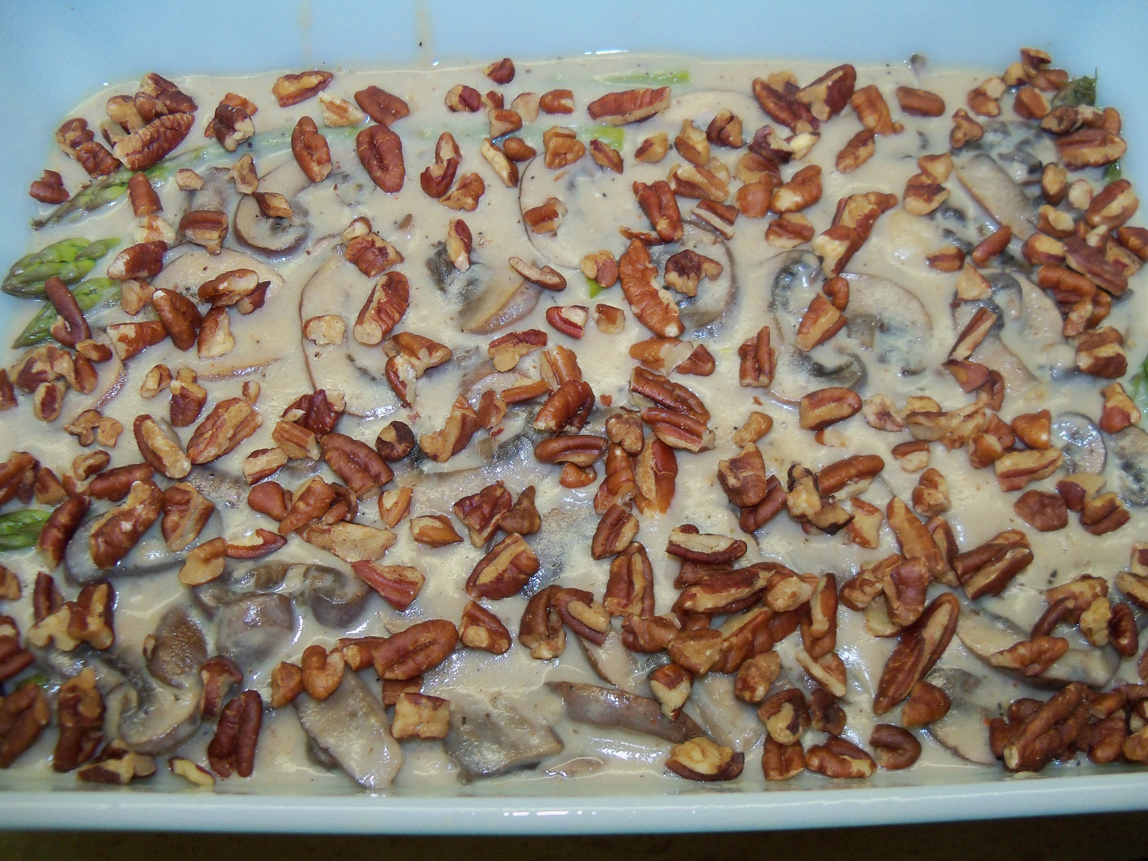 In my twenties I became vegetarian and experienced my first real interest in cooking and healthy eating. I decided it was time to gussy up the Asparagus Casserole. The canned asparagus had to go – I would use fresh. I would also add a small can of mushrooms to the soup so there’d be real mushroom slices, not just small flecks of unidentifiable gray matter. Leave the cheese. Keep the pecans. Add some sherry. Add some more sherry. And – ta da! use bread crumbs instead of crumble saltines on top.