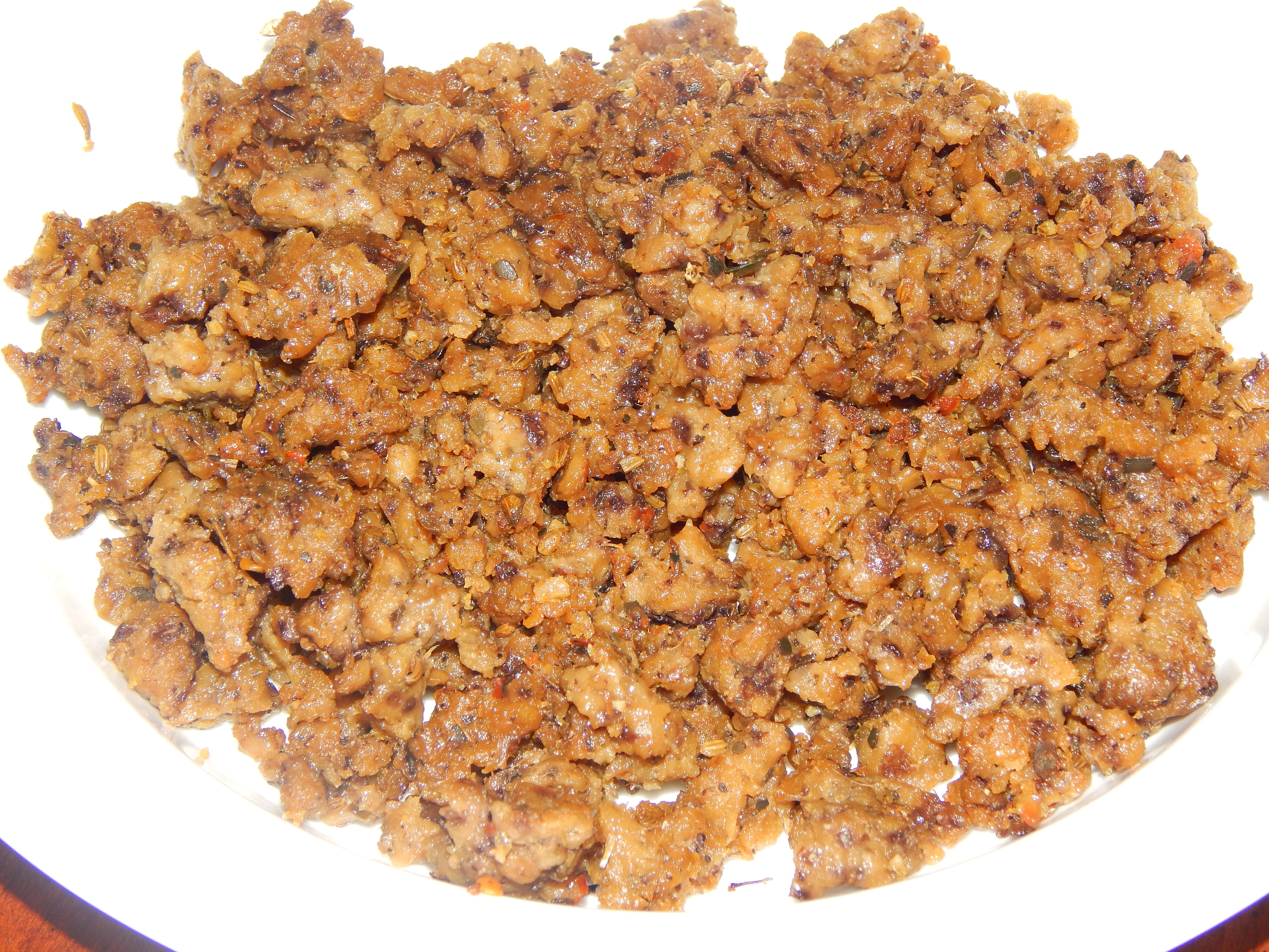Enter Upton’s Naturals Italian Seitan crumbles. About a month ago, Upton’s sent me some coupons to sample their all-natural seitan products, in return for posting product reviews and developing a few recipes. Tuesday I was testing their Italian Seitan crumbles. I wasn’t sure what I was going to do with them, but the first step, of course, was browning them in a skillet with a wee bit of olive oil.