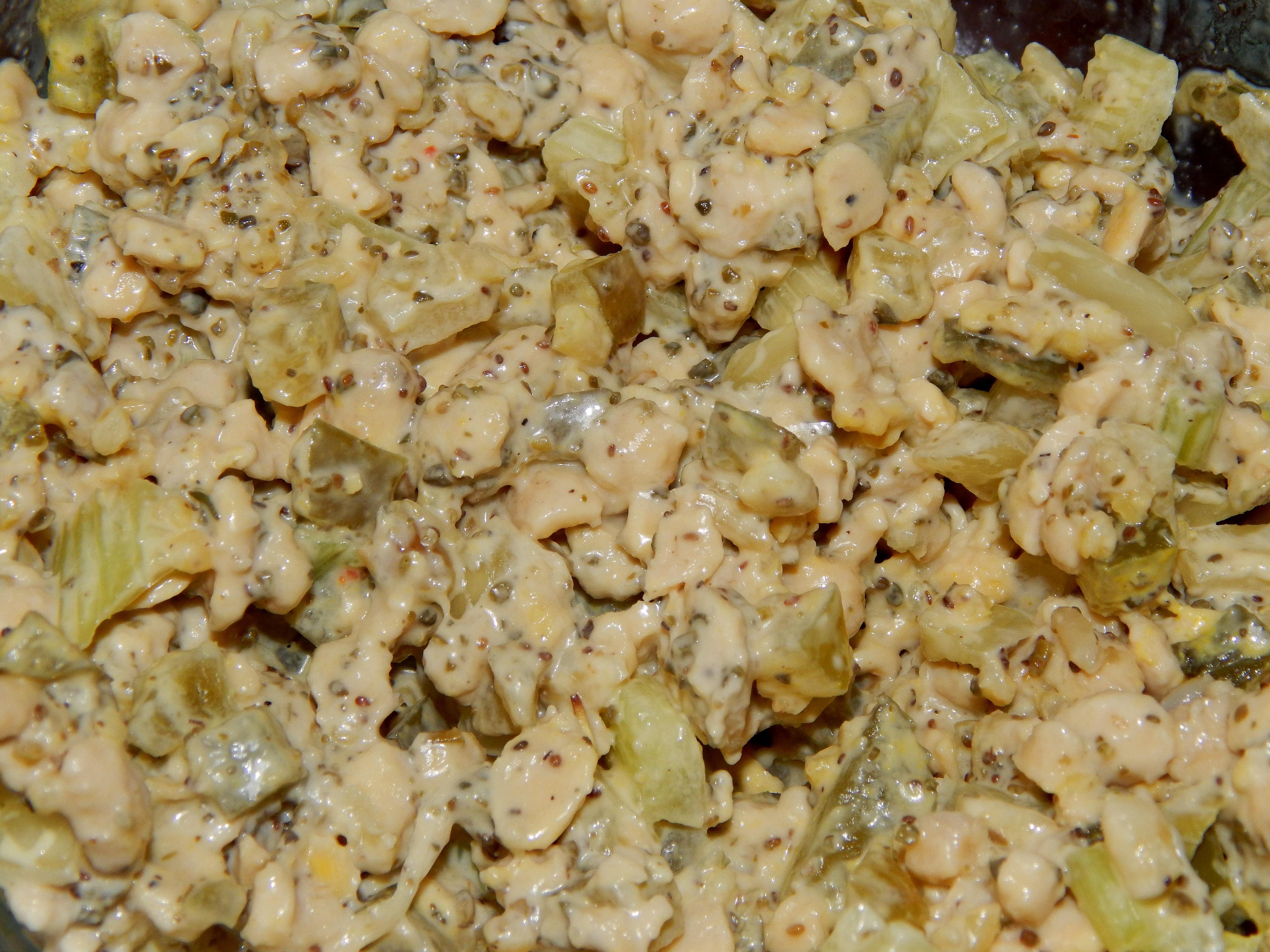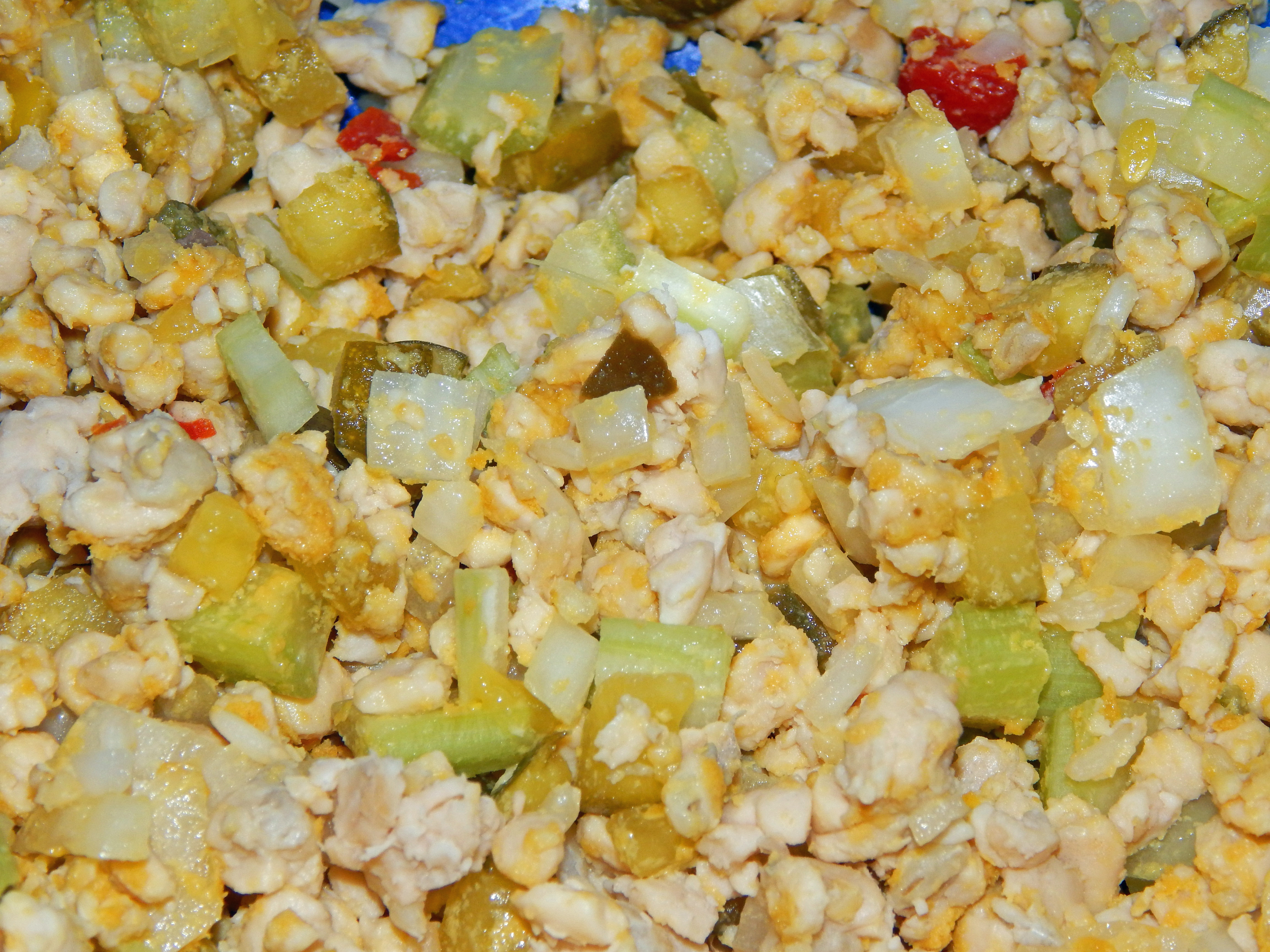 Add the onion, sweet pickles, dill pickles, chopped celery, and nutritional yeast to the tempeh. Mix gently.