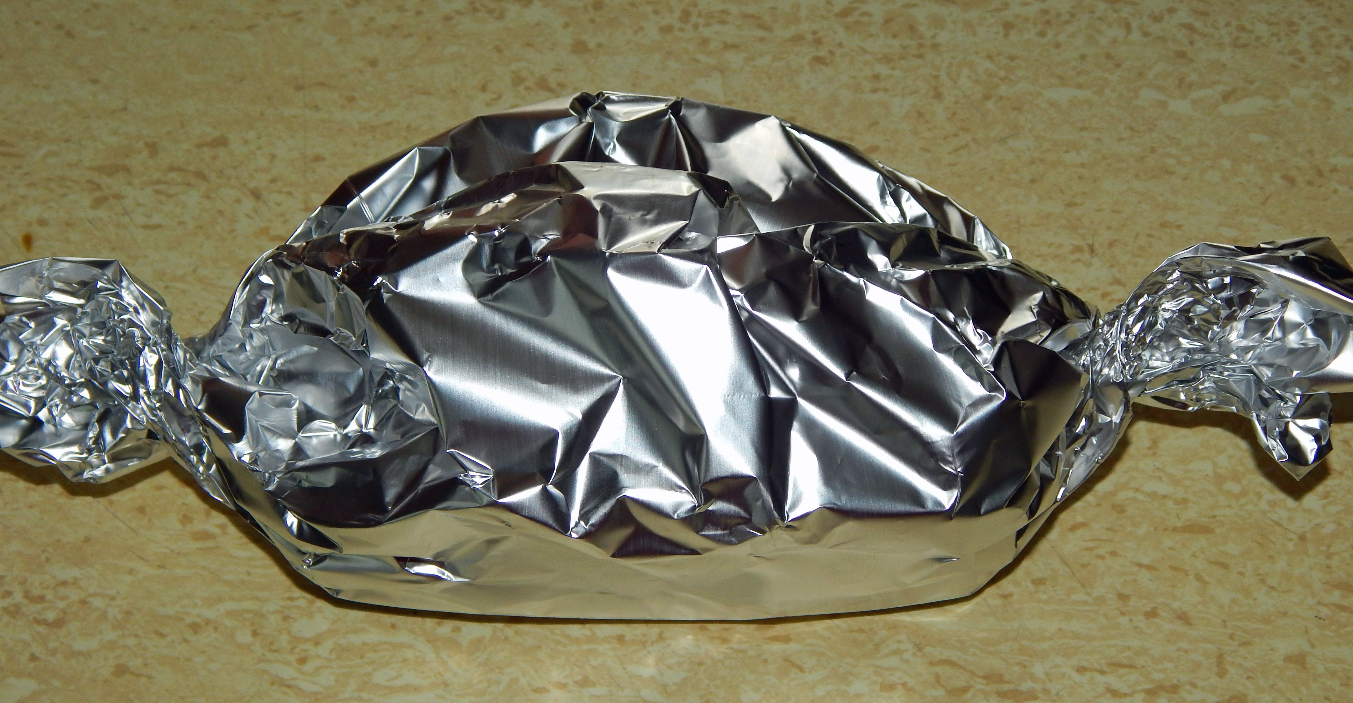 Roll the foil up around the sandwich, twisting and pinching the ends.
