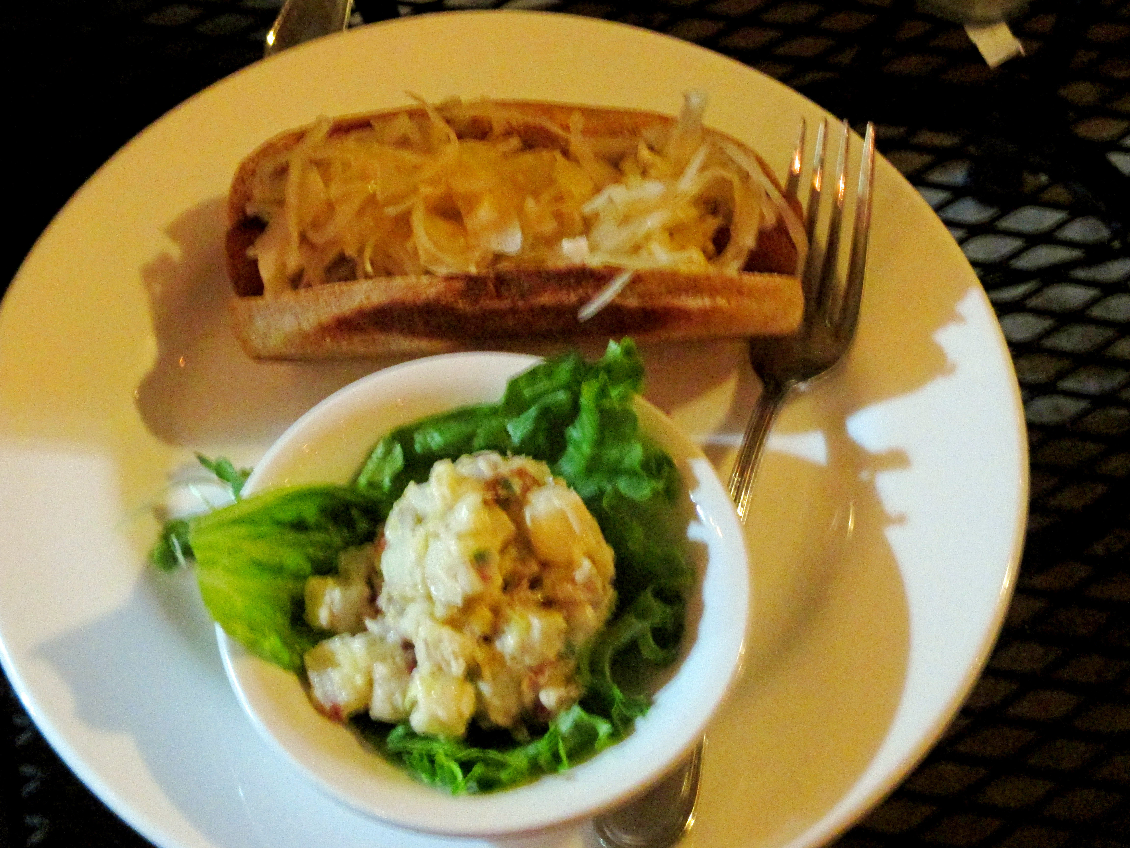 We sat down to eat and we were STARVING. So much so that my partner had ordered two entrees … a vegan hot dog with house made sauerkraut (you could also get it with relish). He chose red bliss potato salad as his side … excellent.