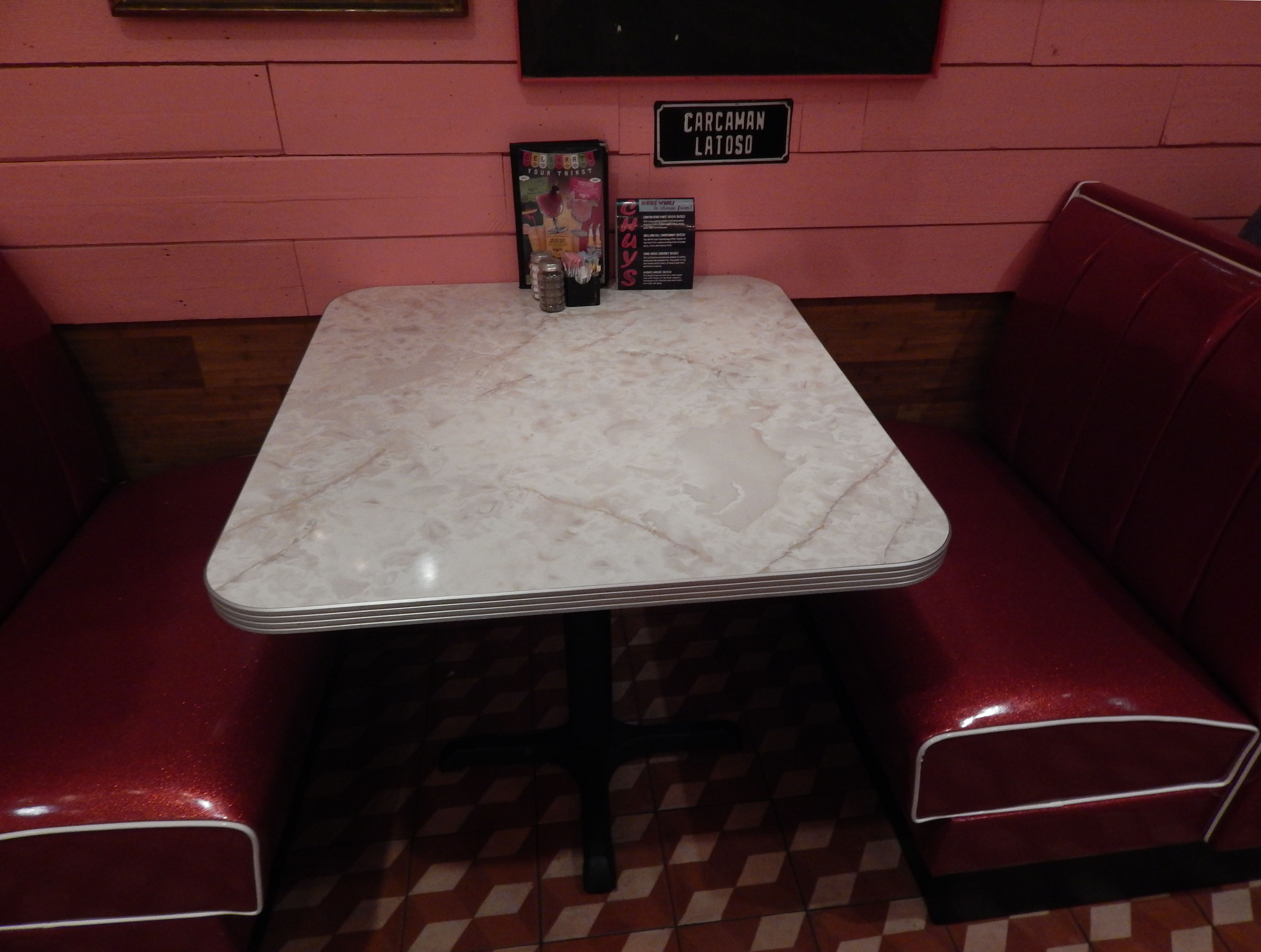 This is the main dining room. Here Chuy’s seems to be going for a retro Mexican diner look, with diner furniture, red vinyl booths and large photos/paintings of what I can only assume are supposed to be old Mexican film stars or others of note.