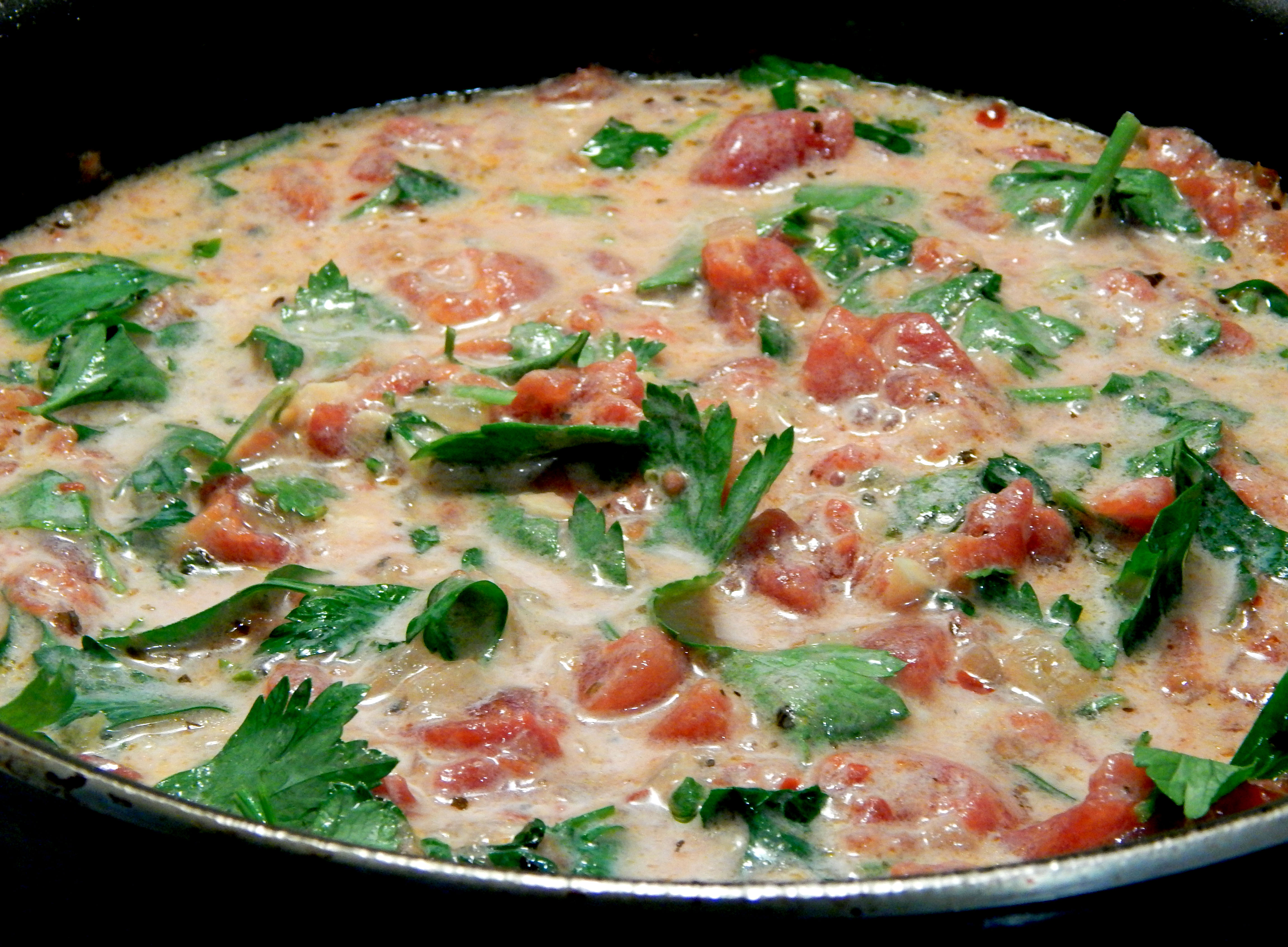 Add milk and parsley. The milk will cool the sauce off – continue cooking over low-to-medium heat until the sauce is warmed through again and the parsley has slightly wilted.