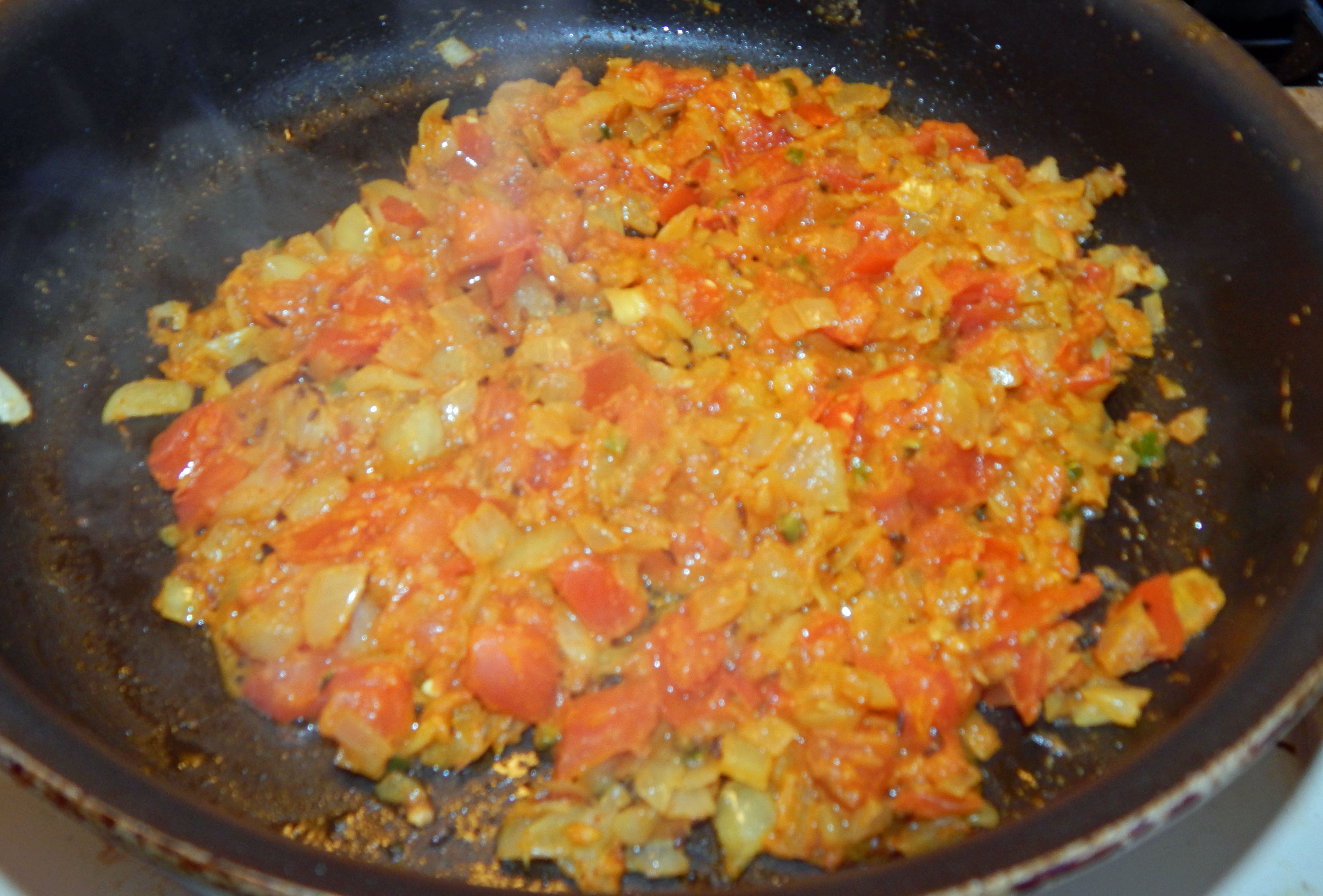 Add the garlic and ginger and cook for another 5 minutes or until the onions start turning translucent. Always watch to make sure they don’t burn – add a little more oil, if necessary. Add the Roma tomatoes (or crushed tomatoes), coriander, and turmeric. Stir to make sure spices are evenly distributed, then reduce heat and cook for another 8 minutes, or until the tomatoes are soft and pulpy.