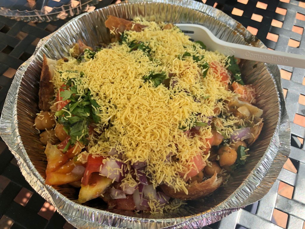 Not only was it Indian food, it was what A. would call Indian Street food – rarely seen in Charlotte. Samosa chaat, bhel, vada pav, pav bhaji.