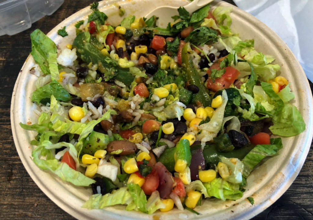 Sold out? At 12:30? I sighed and got a burrito bowl, with black and pinto beans, fajita vegetables, guacamole, and some random toppings – salsa, onions (not afraid to go back to work with stinky breath, pesky coworkers might keep their distance), fresh jalapenos, cilantro. It’s good, perfectly decent, nothing wrong with it but not great.