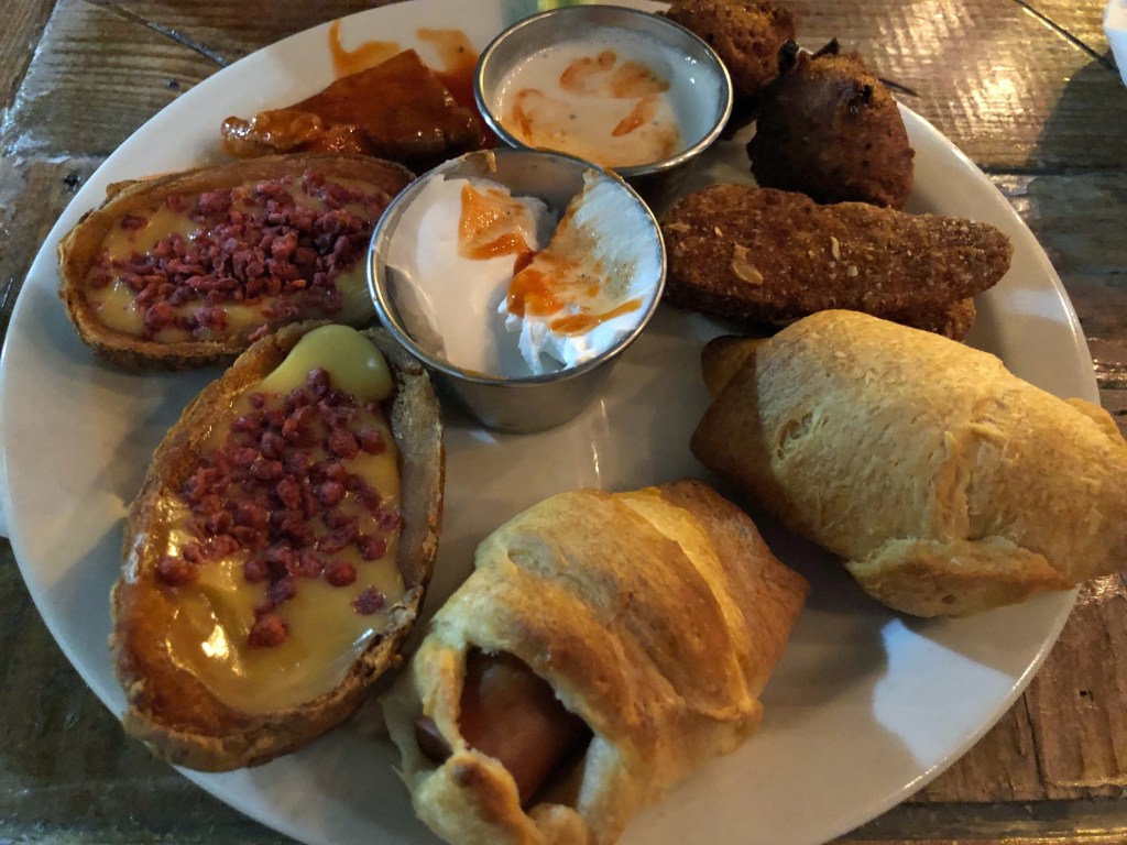 - Two potato skins, which we enjoyed. Even though they were highly processed – supermarket vegan cheese, “bacon” bits, probably McCormick’s – they were tasty. They also had plenty of potato still attached. This is the only item I would recommend from this platter.