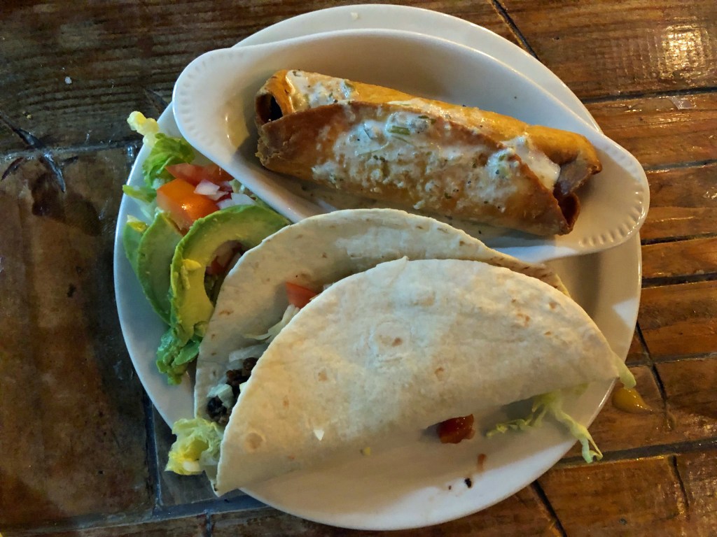 A. had also ordered the special of the day – a taco and chimichanga. It eventually came out – long after the hot dog and drumsticks! We both thought these were good – however, the filling was clearly a crumbled black bean burger patty.