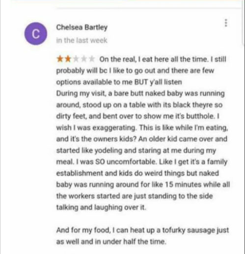 Apparently, in 2017, a woman posted a Yelp review. She was dining and a toddler ran nekkid in front of her, jumped up on a table, and bent over to show her its butthole. Meanwhile, its older sibling came to her table and yodeled at her. Other Yelp users chimed in with stories of children running amok and babies defecating on the floor.