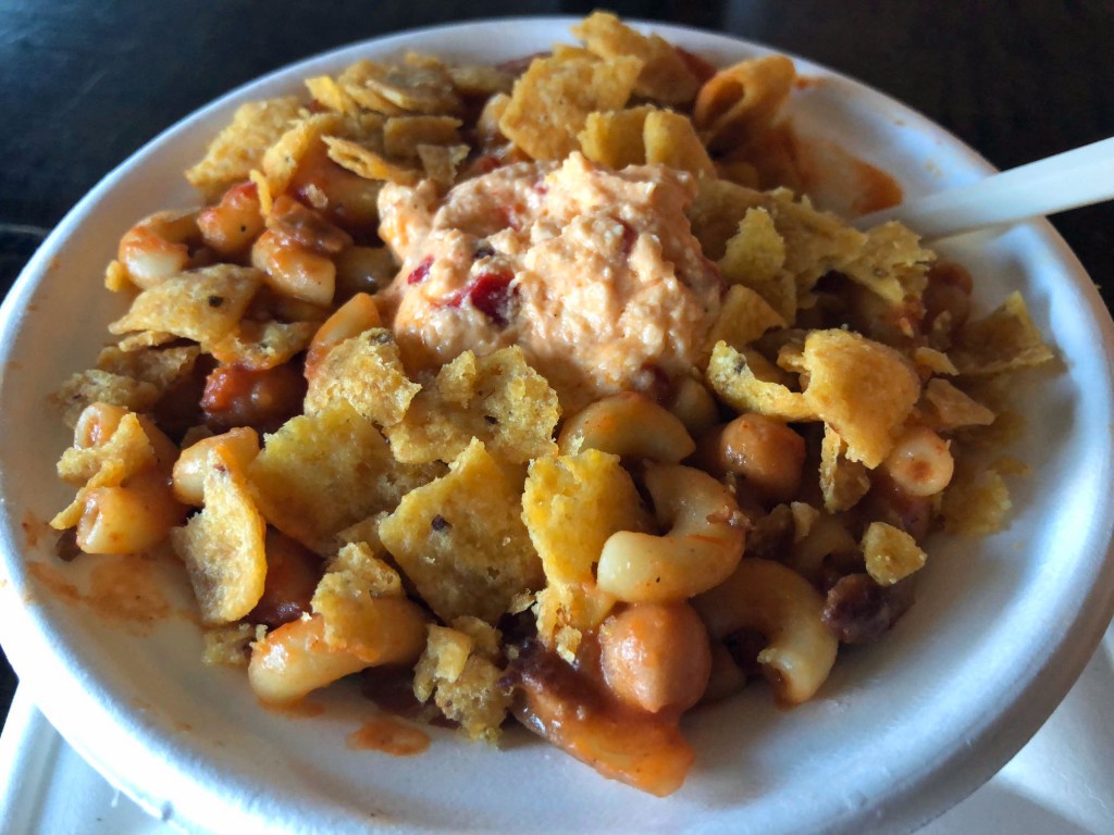 It starts with the Award Winning Vegan Mac and Cheese. Then it’s mixed with the Vegan Chili. Then it’s topped with Fritos corn chips and a small scoop of vegan pimento cheese.