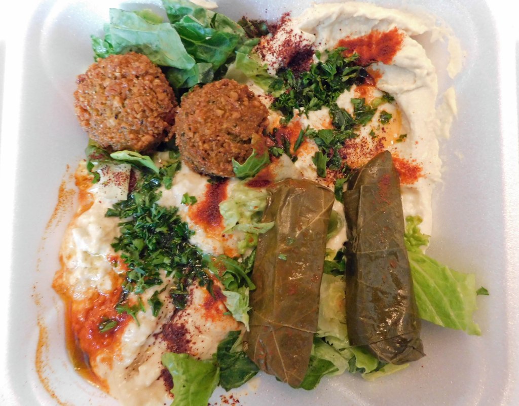 This was a sampler of some of the most common appetizers – falafel, hummus, baba ganoush, and grape leaves (also called yalagni in Middle Eastern restaurants and dolmas in Greek restaurants).