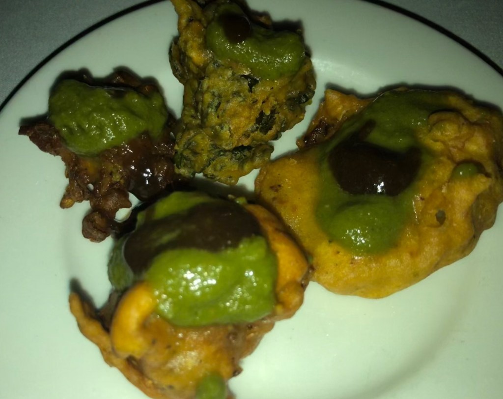 We chose the pakoras and received 10; my traveling companion took six and I took four. I wound up with a potato pakora, a cauliflower pakora, an onion pakora, and what seemed to be a mixed pakora. I would have liked a mirch (hot pepper) pakora – my fave! But these were all tasty, non-greasy, and served with a green sauce and a tamarind sauce.