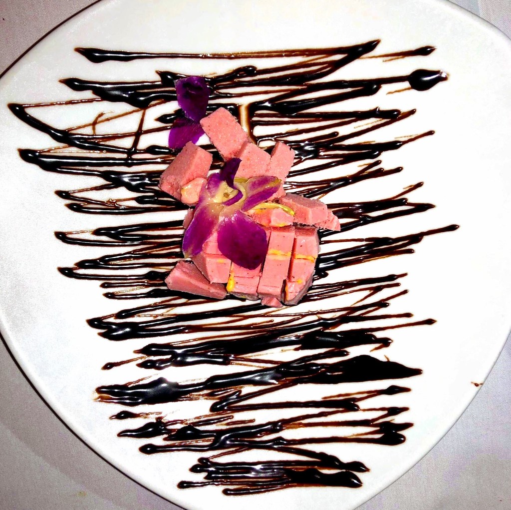 And THIS … was da bomb. Ice cream made with rosewater, cardamom, and coconut milk. Served over a dark chocolate drizzle with a pretty little edible flower.