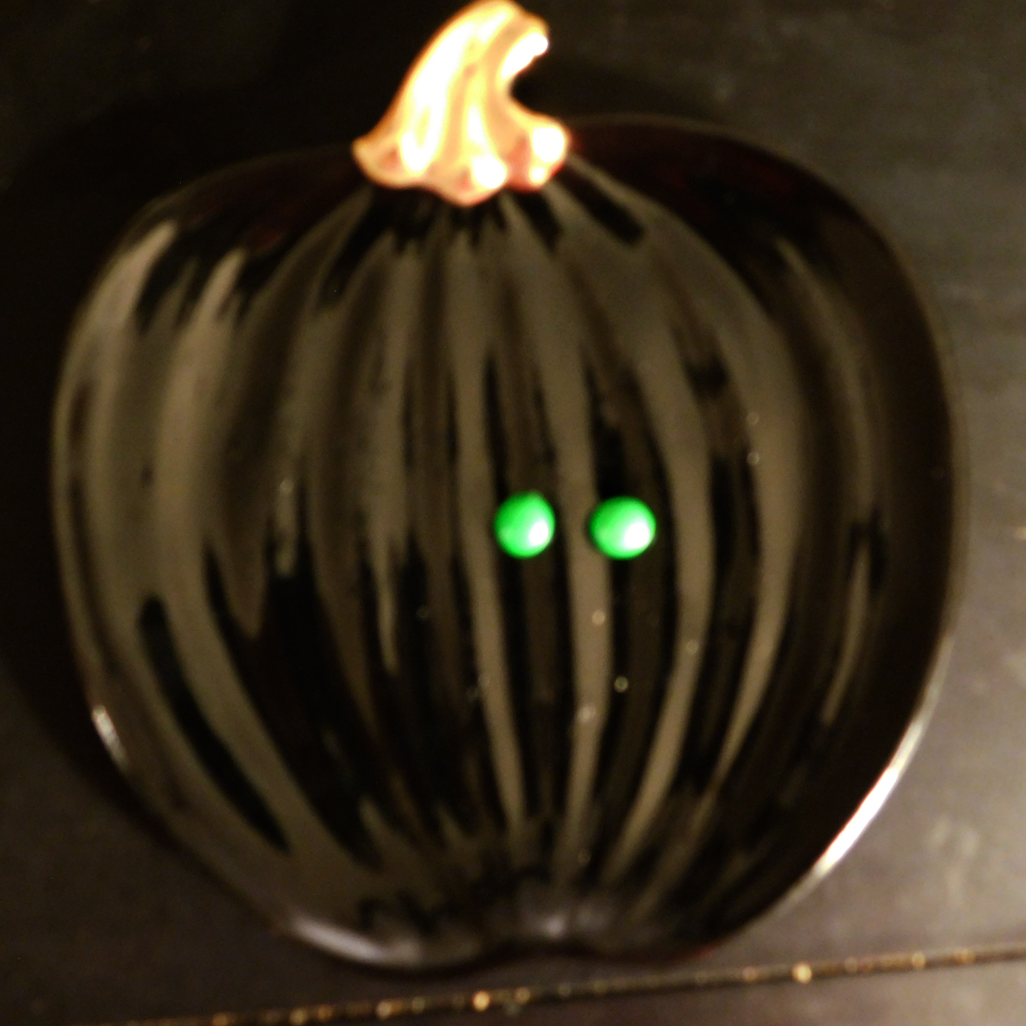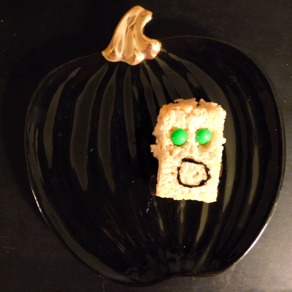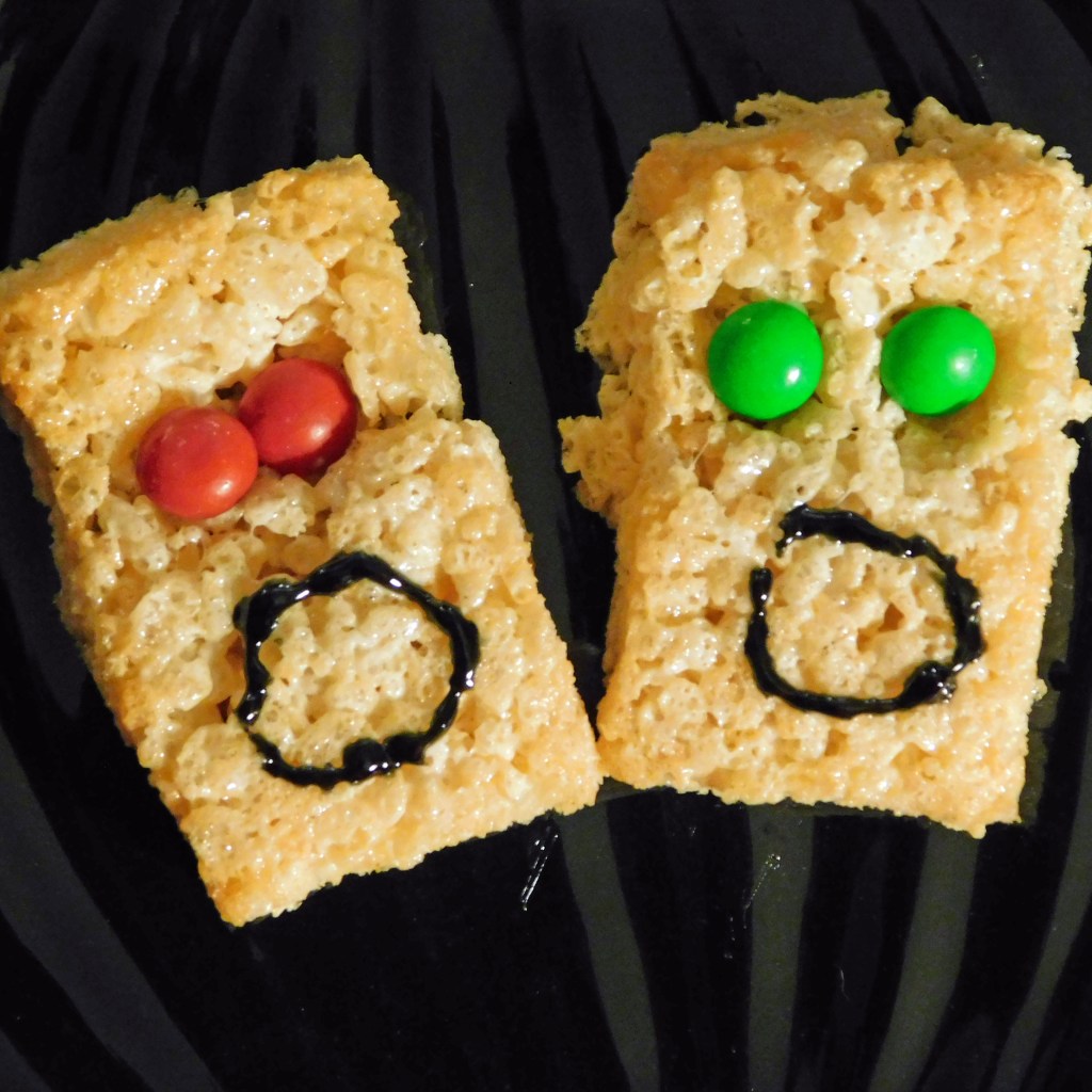 Gently press in Skittles for eyes. (You’ll have to guestimate.) If you do this while the treats are too hot, the colors will run; if you do this after the treats are completely cooled, the candies won’t stick.