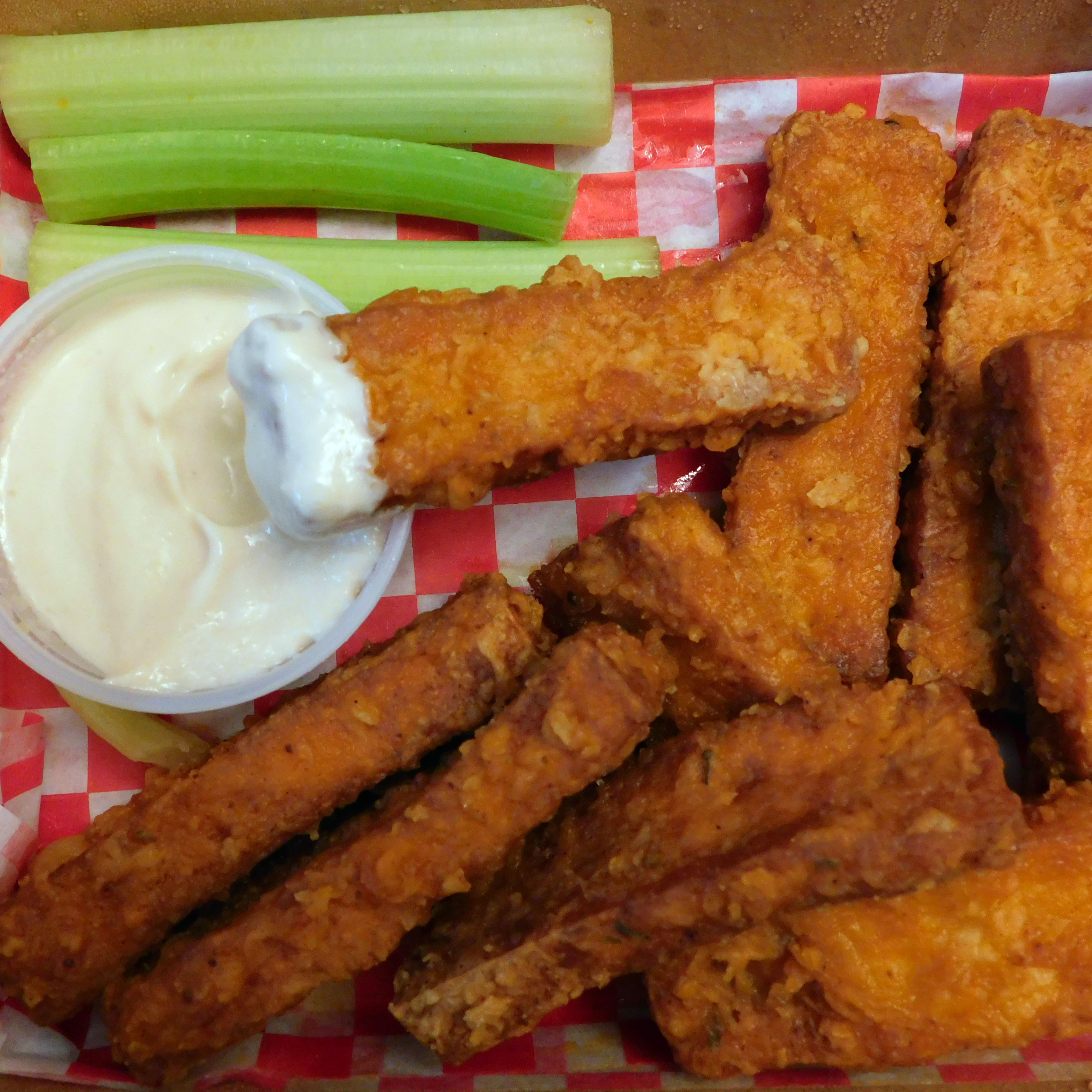 Bean is keeping up the tradition with Fried Tofu Fingers ($10-ish for 8). Extra-firm tofu cut into thick slices, battered and fried, and tossed in sauce. You can choose Southern Style (no sauce), Buffalo, BBQ, Teriyaki, or Korean BBQ sauce. Can’t decide? You can mix and match. Then you have your dipping sauce – a choice of Ranch or Blue Cheesish. .