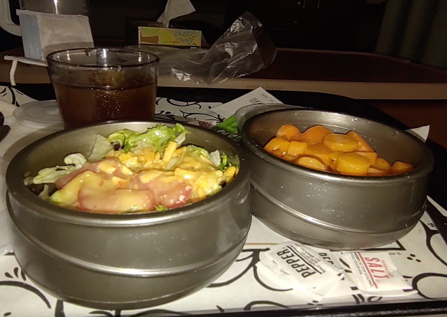 A more typical lunch/dinner would have been a salad (iceberg lettuce, tomatoes, dressing, and real dairy cheese) and another dish of those d*mn carrots.