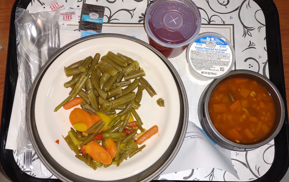 I transferred from Atrium Health to this center on Christmas morning, and my Christmas dinner – as you can see – consisted of a plate of green beans and carrots, a cup of vegetable soup (I don’t know what the broth was, I don’t want to know what the broth was, and I think I’m happier not knowing), and a very small container of low-fat vanilla ice cream made with real dairy milk.