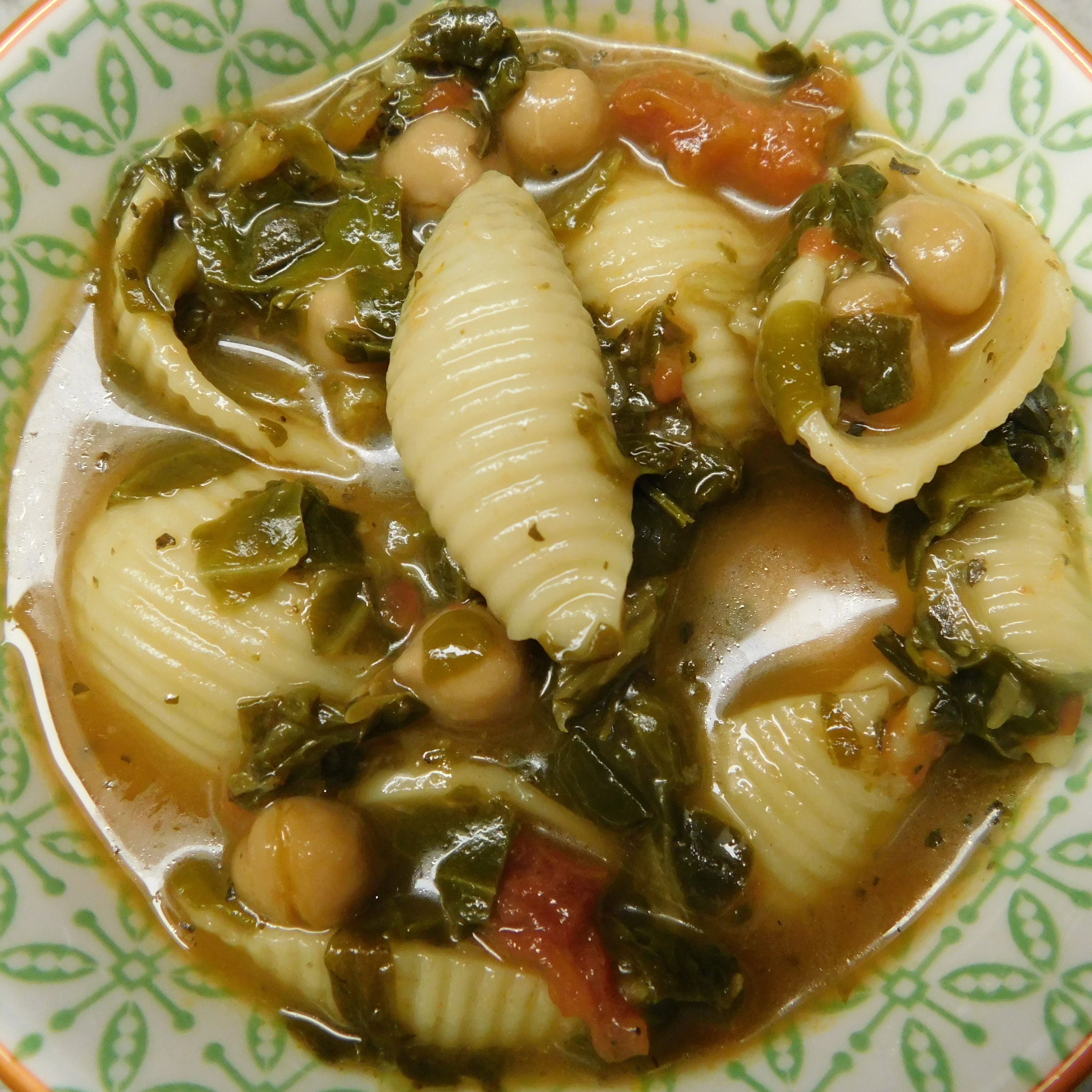 Add the broth, chickpeas, tomatoes, basil, Italian seasoning, and dried minced onion. (This will look like a lot of dried spices but don’t be alarmed. There is no need to panic.) Bring to a boil, then reduce heat and simmer for five minutes. Add the defrosted spinach and cook another 5 minutes. Finally, add the pasta noodles, and cook for the recommended noodle time.
