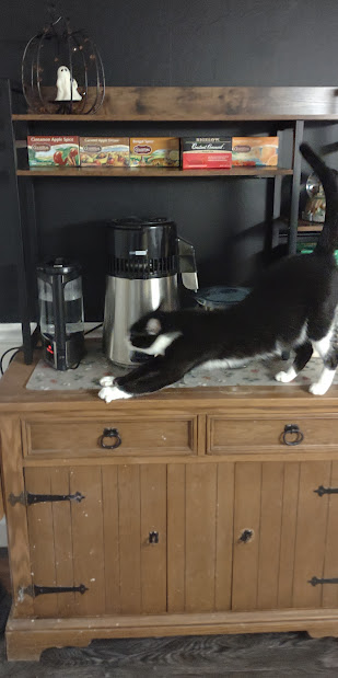 To support my efforts in drinking more water and tea (instead of coffee and Coke), my friend gave me a water distiller/purifier. My kitchen is small, so I put it in my breakfast room on a beat-up hutch I’d been thinking of painting or tossing. (Mostly tossing). He then repurposed part of an old computer desk for shelves.